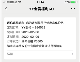10、定制靓号有两种方式:靓号商城-私人定制(此页面)、YY号80011上架。若通过YY号80011定制的靓号,不拥有7天支付链接保护,两种定制的给出支付链接方式不一致,请注意区分。